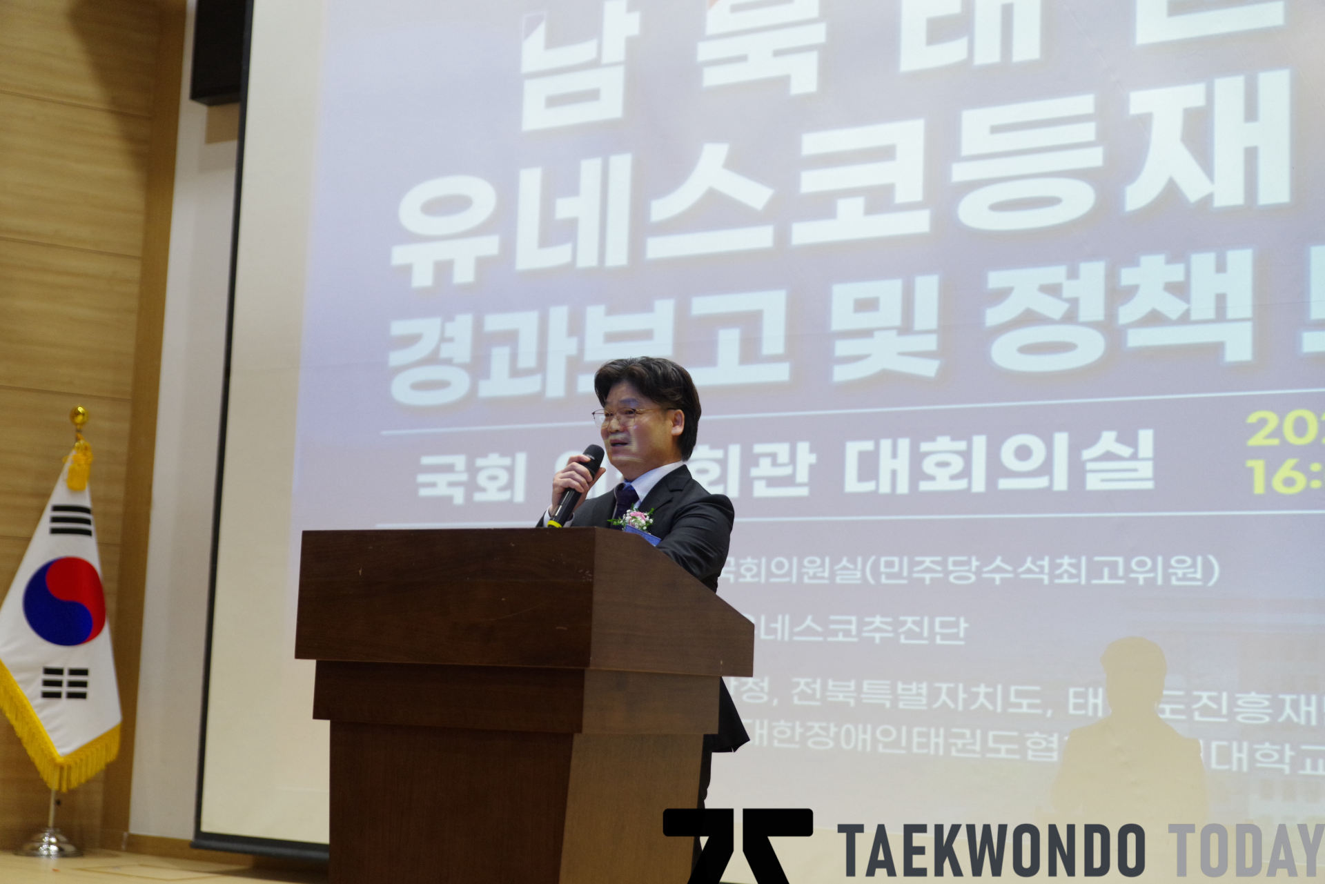 전현희 의원은 환영사에서 "전 세계 215여 국이 함께 하는 태권도는 단순한 무술이 아닌 한민족의 정신이자 대한민국의 자랑스러운 'K-스포츠'"라며 "지난해 3월 북한이 단독으로 유네스코에 태권도 인류무형문화유산 등재를 신청했지만 아무런 대책 없이 수수방관해 우리나라 태권도의 정통성과 국제적 주도권이 빼앗길 위기에 놓였다"고 지적했다. 이어 "이 문제는 단순히 등재 여부를 넘어 대한 민국의 문화주권과 정체성, 그리고 민족의 자존심이 걸린 일"이라며 "이제라도 K-태권도 종주국으로서 자존심을 지킬 수 있도록 적극적으로 나서서 가능하다면 남북 공동으로 태권도의 유네스코 등재를 추진해야 한다"고 강조했다. 전 의원은 "오늘 이 자리가 단순한 경과보고를 넘어 태권도를 통해 한반도의 미래를 이야기하고 단절된 남북이 문화로 다시 만날 수 있는 평화의 기회가 되기를 기대한다"며 "국민 한 사람 한 사람의 관심과 연대가 모일 때 태권도는 단순한 스포츠를 넘어 민족 화합과 평화의 상징으로 다시 서게 될 것"이라고 밝혔다.