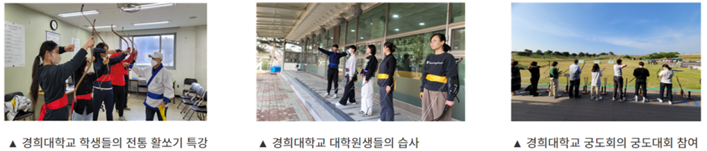 2018년부터 진행되어 온 전통 활쏘기 특강 및 체험프로그램을 통해 교내 학생 및 유학생, 대학원생은 물론 일반인들에게 전통 활쏘기 문화를 전승하는데 꾸준한 노력을 보여주고 있는 가운데 2024년 국가무형유산 공동체종목 대학 연계 지원 사업에 선정(한국 전통 활쏘기 전승교육)되면서 학내 뿐만 아니라 국내외 활쏘기의 우수성과 문화재로의 가치 확산에 더욱 박차를 가할 것으로 기대된다.